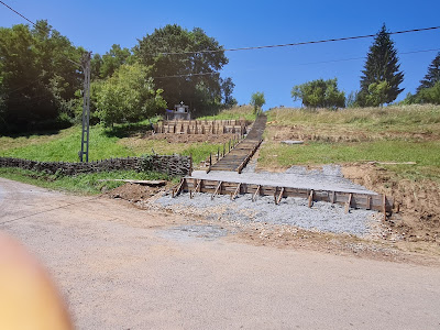 Am făcut o plimbare prin sat, la vremea când razele soarelui nu erau prea fierbinți, Plecând de pe Ulița Găzdăcoilor am văzut capela acoperită. Am mers la Primărie dar nu am putut intra în curte, intrarea era blocată, deoarece ieri s-au turnat aleile de beton amprentat. Culmea, dispăruse și căputul de la intrare. În încercarea de a intra în Primărie am observat că pe sala de sport se montează acoperișul. Lângă o anexă a primăriei, în două corturi improvizate, doi sculptori, Eugen Petri și Șerban Alexiu, oaspeți ai căbeștenilor și în vara trecută, care lucrau la ansamblul ce va fi montat pe Monumentul Eroilor din Cimitir. Trecând pe lângă viitoarea sală de sport am observat că în curtea școlii a fost turnat beton, iar întorcându-mă m-am întâlnit cu un angajat al primăriei care repara peretele exterioral clădirii. Nu-i rău, se muncește. Dacă va dispărea și ruina din vaioagă, cea care în trecut se numea dispensar veterinar... Dacă...